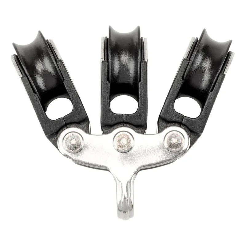 The blocks can now articulate freely of one another allowing each to align perfectly with any rope angle.
