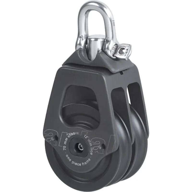 A complete range from 50 to 140 mm sheaves in single, double, triple, fiddle, and deck versions, for webbing or shackle connection. Sizes are based on the range of HR shackles available and on their safe working load (SWL). The HR swivel head. Made in high resistance stainless steel, with three positions: swivelling head, longitudinal lock and transversal lock. HR shackles included. The one-piece-frame. The one-piece aluminium extruded body is the strongest and lightest solution, no assembling pin rivets or screws and nuts. CNC machined - polished - hard black anodized and teflon coated. The composite fibre sheave. The resin (aluminium on larger mod) sheave runs on the main Composite Fibre bearing and on a ground stainless steel hub: low friction highloads - no lubricant required. The self-captive side ball bearing reduces the friction and makes disassembling, cleaning and maintenance very easy. Sheaves are supplied with the s.steel hub, they are available separately.