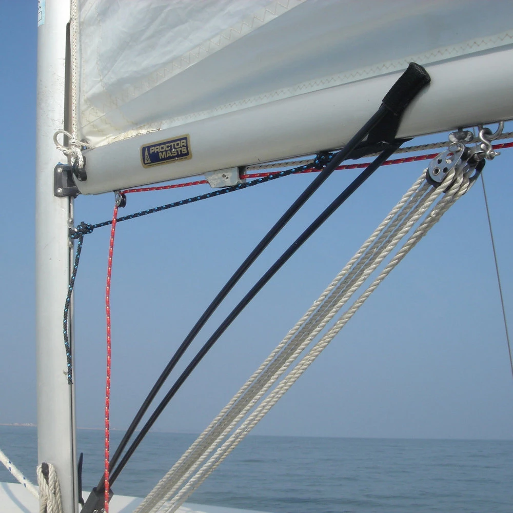 With no extra parts or drilling required and is simply tied off at the mast to secure in place, negating the need for drilling. At the top of the rods, a fully adjustable webbing cradle supports the boom and as the cradle is not directly attached to the boom, it does not restrict the boom from rolling around its central axis to follow the sail when reefing.