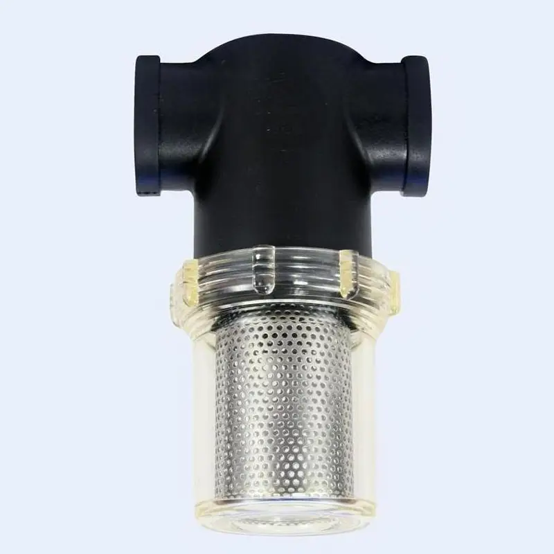 The clear polycarbonate screw-on filter bucket offers easy viewing of the stainless steel filter basket without removal and its unique C clamp mounting bracket allows the strainer to be snapped into place and rotated as needed to face any direction to fit tight spaces.